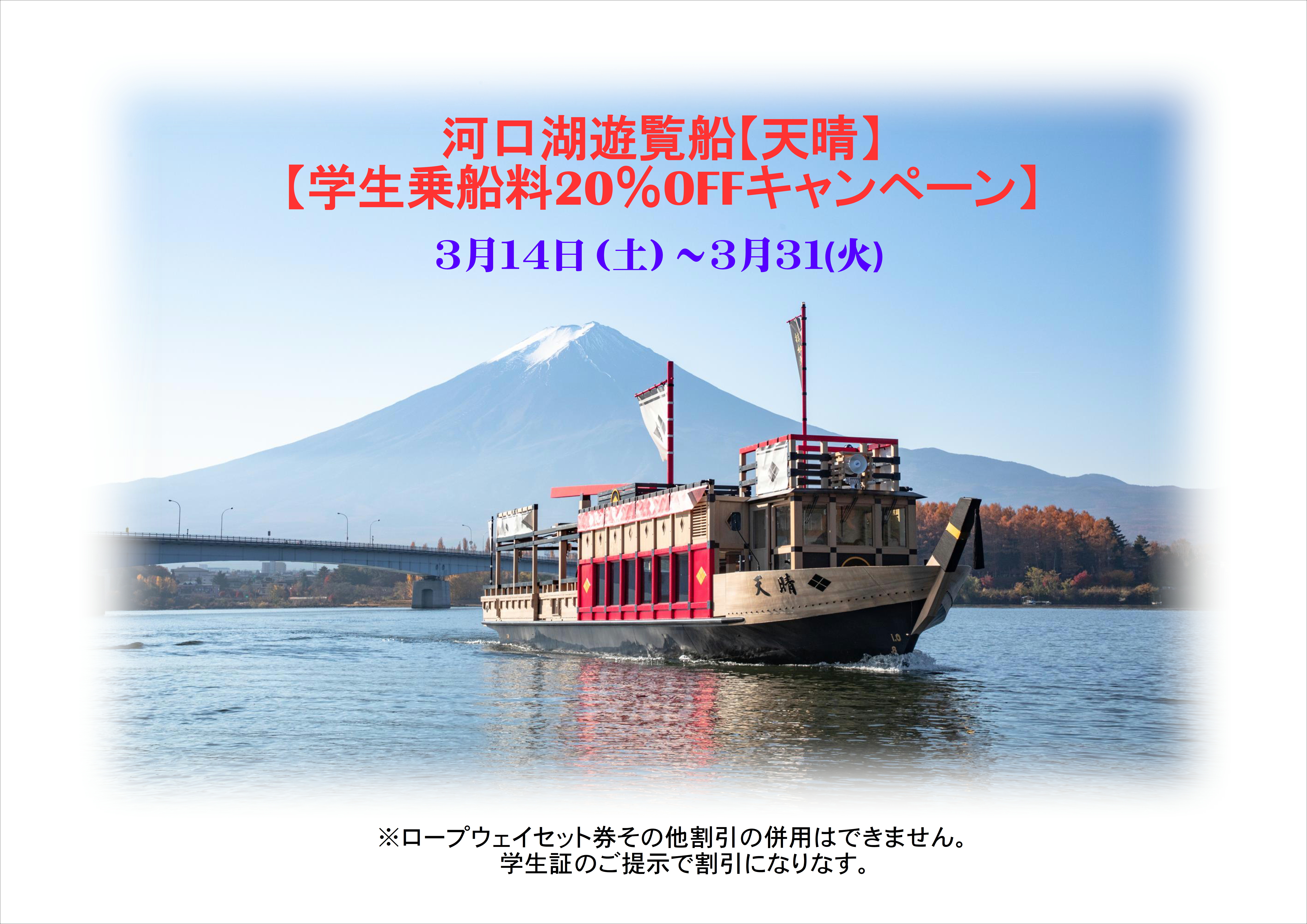 河口湖遊覧船 学生乗船料20%OFFキャンペーン 期間 2026年 3月14日(土)~3月31日(火) 対象のお客様は学生証のご提示をお願い致します。 その他割引セット券との併用はできません。 河口湖遊覧船 スタッフ一同心よりお待ちしております。